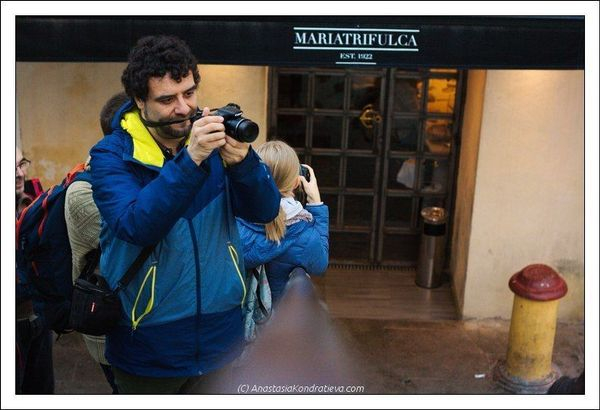 Cuando empezamos a caminar por la calle Pureza (una de las más emblemáticas de Triana) la lluvia cayó sobre nosotros con una fuerza ya imparable. Es posible que fuera culpa de Miguel porque 2 minutos antes de eso andaba pidiendo un charco…En cualquier caso ya ni los paraguas podían protegernos y obivamente ninguno de nosotros quería poner en riesgo su eqquipo así que nos escondimos donde pudimos. Un grupo se quedó cobijado en una Iglesia cercana acompañados de Miguel mientras que los demás nos metimos en el Bar Remesal. Se le puede sacar algo positivo a todo así que durante los quince o veinte minutos en los que la lluvia caía con fuerza pudimos tomarnos una cerveza, conocer un poco a los nuevos asistentes ponernos al día con los asiduos. A Diego incluso le dió tiempo para hacer una foto chulísima justo en la puerta del bar.