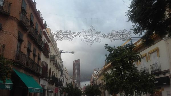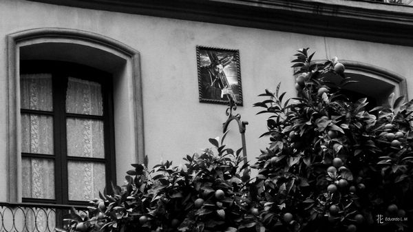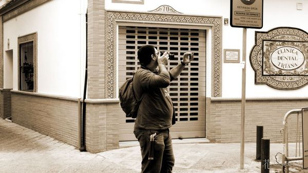Habíamos planteado un recorrido variopinto para poder apreciar el conocidísimo barrio de Triana desde los diferentes puntos de vista así que habíamos quedado en la puerta de la Parroquia Nuestra Señora de la O. Después de la introducción habitual Diego dio unas cuantas pautas a los asistentes para sacar mayor provecho a la fotografía callejera justamente cuando estaba acabando la misma se puso a chispear. ¡Hola señores de la predicción del tiempo! ¡Llevabáis una semana diciendo que no iba a caer una gota hasta las 12 de la noche! 😀 Como no somos gente fácil de intimidar decidimos seguir con el recorrido planeado a no ser que se pusiera a llover de verdad.
