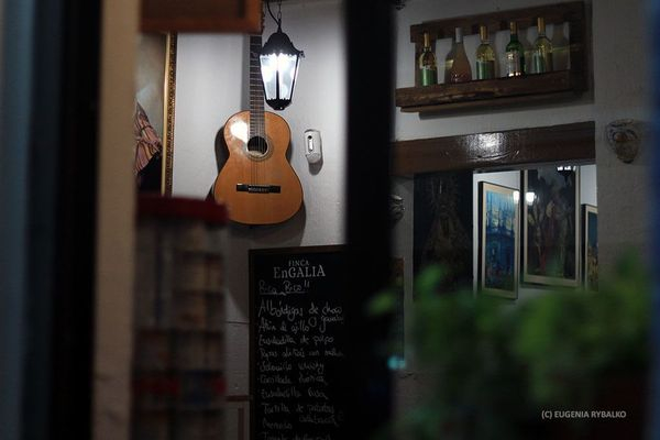 Cuando empezamos a caminar por la calle Pureza (una de las más emblemáticas de Triana) la lluvia cayó sobre nosotros con una fuerza ya imparable. Es posible que fuera culpa de Miguel porque 2 minutos antes de eso andaba pidiendo un charco…En cualquier caso ya ni los paraguas podían protegernos y obivamente ninguno de nosotros quería poner en riesgo su eqquipo así que nos escondimos donde pudimos. Un grupo se quedó cobijado en una Iglesia cercana acompañados de Miguel mientras que los demás nos metimos en el Bar Remesal. Se le puede sacar algo positivo a todo así que durante los quince o veinte minutos en los que la lluvia caía con fuerza pudimos tomarnos una cerveza, conocer un poco a los nuevos asistentes ponernos al día con los asiduos. A Diego incluso le dió tiempo para hacer una foto chulísima justo en la puerta del bar.